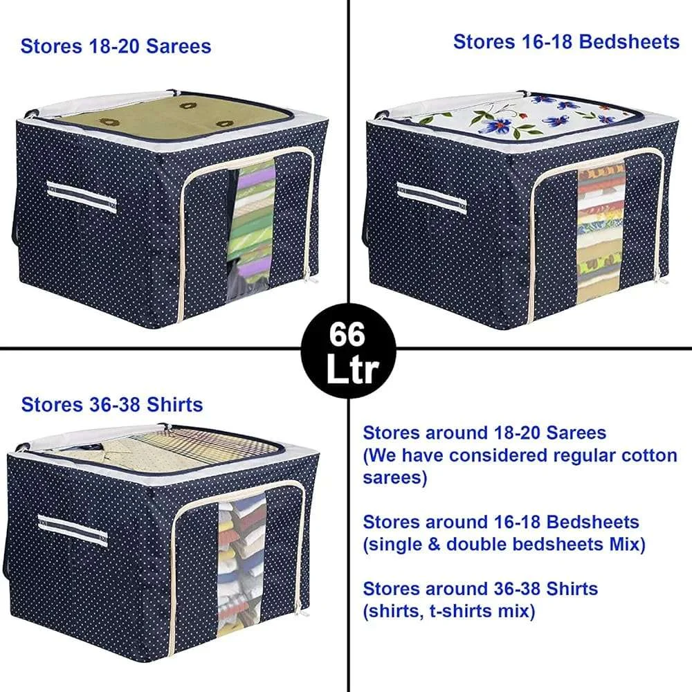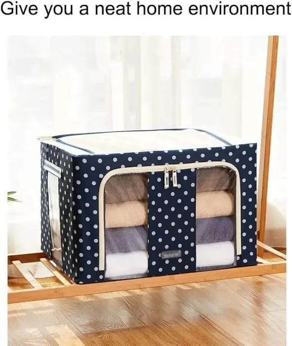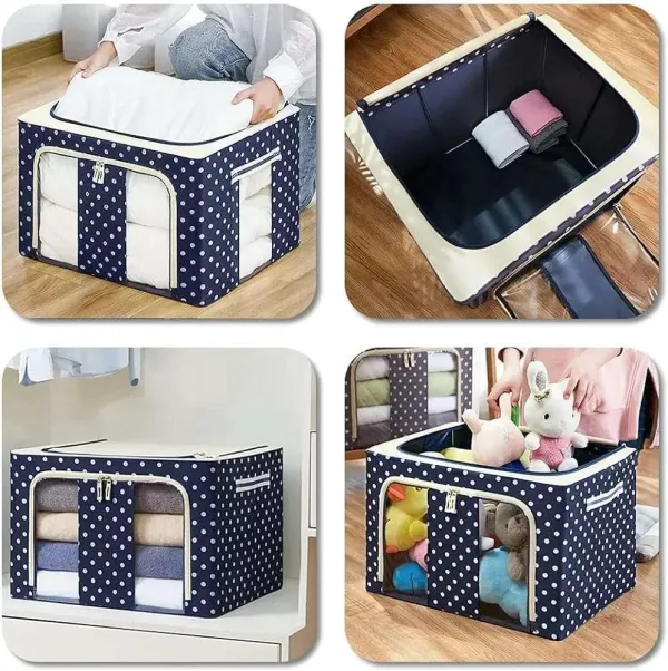 • The Large Capacity Storage Box is a versatile 66L storage solution, ideal for storing a variety of items including seasonal clothing, bedding, toys, books, and more. Made from waterproof oxford cloth with a sturdy stainless steel frame, it is both supportable and foldable, allowing for easy stacking and space-saving storage when not in use. The storage box features two clear windows and zippered flap doors for easy viewing and access to contents. It also has reinforced handles for easy movement and durability. This multi-purpose storage box is suitable for use in various spaces such as shelves, closets, garages, basements, attics, and under beds in homes, offices, or dorms. Its easy assembly involves simply expanding the metal frame into a large storage bin.